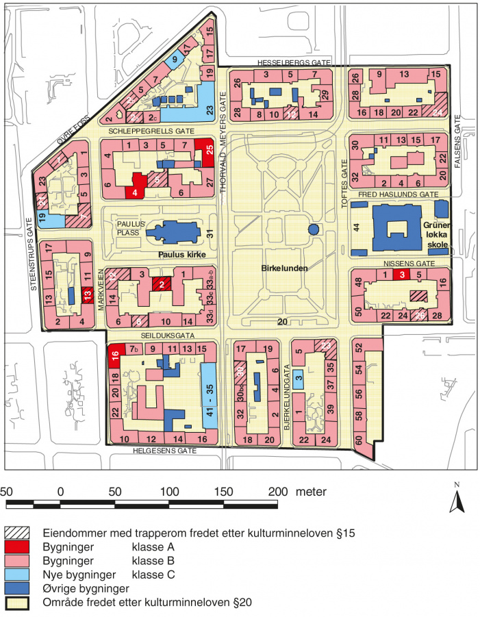 | − | Bebyggelsen består av leiegårder i mur, stort sett i fire etasjer fra 1880-årene; i nord stort sett i tre etasjer fra 1870-årene; det er enhetlig karrébebyggelse bygd for datidens arbeiderklasse.[[Fil:Eiendommer_Birkelunden.jpg|miniatyr| | + | Bebyggelsen består av leiegårder i mur, stort sett i fire etasjer fra 1880-årene; i nord stort sett i tre etasjer fra 1870-årene; det er enhetlig karrébebyggelse bygd for datidens arbeiderklasse.[[Fil:Eiendommer_Birkelunden.jpg|miniatyr|901x901px|''Kartskisse over bebyggelsen ved Birkelunden med markering av de fredede bygningene. - Kart: Oslo kommune / Riksantikvaren.'' ]]Plassen og bebyggelsen rundt ble fredet i 2006 som ''Birkelunden kulturmiljø''. Fredningssaken ble påbegynt i 1996, og Riksantikvaren registrerte alle bygningene over en periode på fire år og gjennomførte senere en lokal og sentral høringsrunde. Dette var en pionersak i norsk fredningshistorie ved at man her for første gang gikk til det skritt å frede et helt kulturmiljø i en by. Fredningen omfatter et areal på 116 daa med 15 kvartaler med i alt 139 bygårder, parken Birkelunden med [[Paulus kirke]], tegnet av Henrik Bull, og [[Grünerløkka skole]], tegnet av Henrik Nissen, vis à vis. |