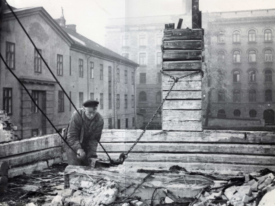 Fra rivingen av Empierkvartalet. Enden av Militærhospitalets langfløy ble demontert og lagret i 1954. Til venste ligger det daværende Justisdepartementet i Grubbegata 9, i bakgrunnen sees Finansdepartementet. - Foto: Oslo Byes Vel