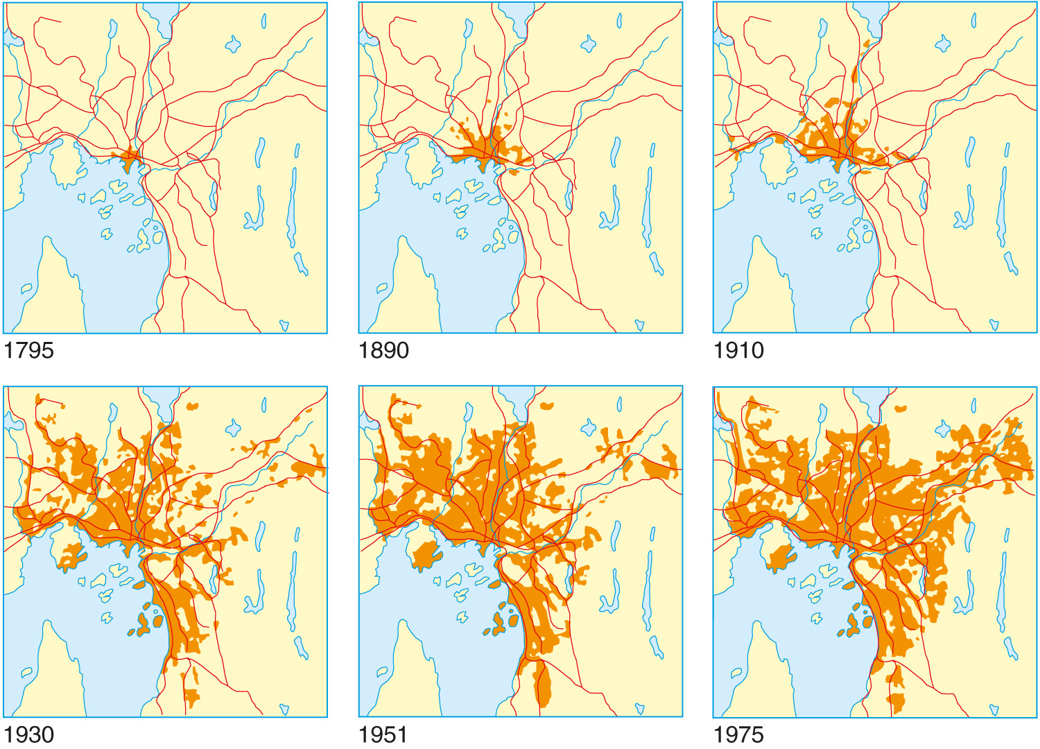 Kartskissene viser bebyggelsens vekst fra 1795 til 1975. Veiene er også inntegnet på de eldre stadiene for å lette orienteringen.