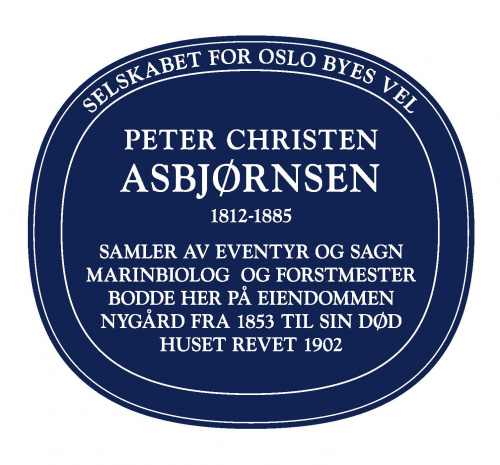Blått skilt for Per Christian Asbjørnsen i Bogstadveien 13 satt opp av Selskabet for Oslo Byes Vel.