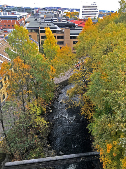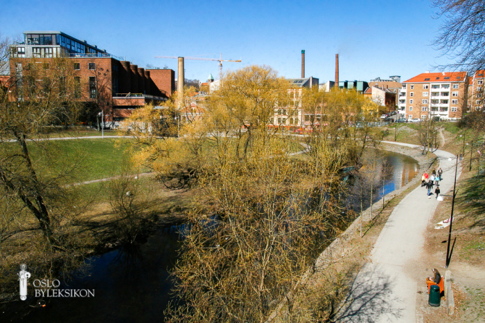 Akerselva sett nordvestover fra Ankerbrua. Til høyre en del av bebyggelsen på nedre Grünerløkka, til venstre sees bl.a. DogA. - Foto: Astrid Ledang / Oslo Byleksikon