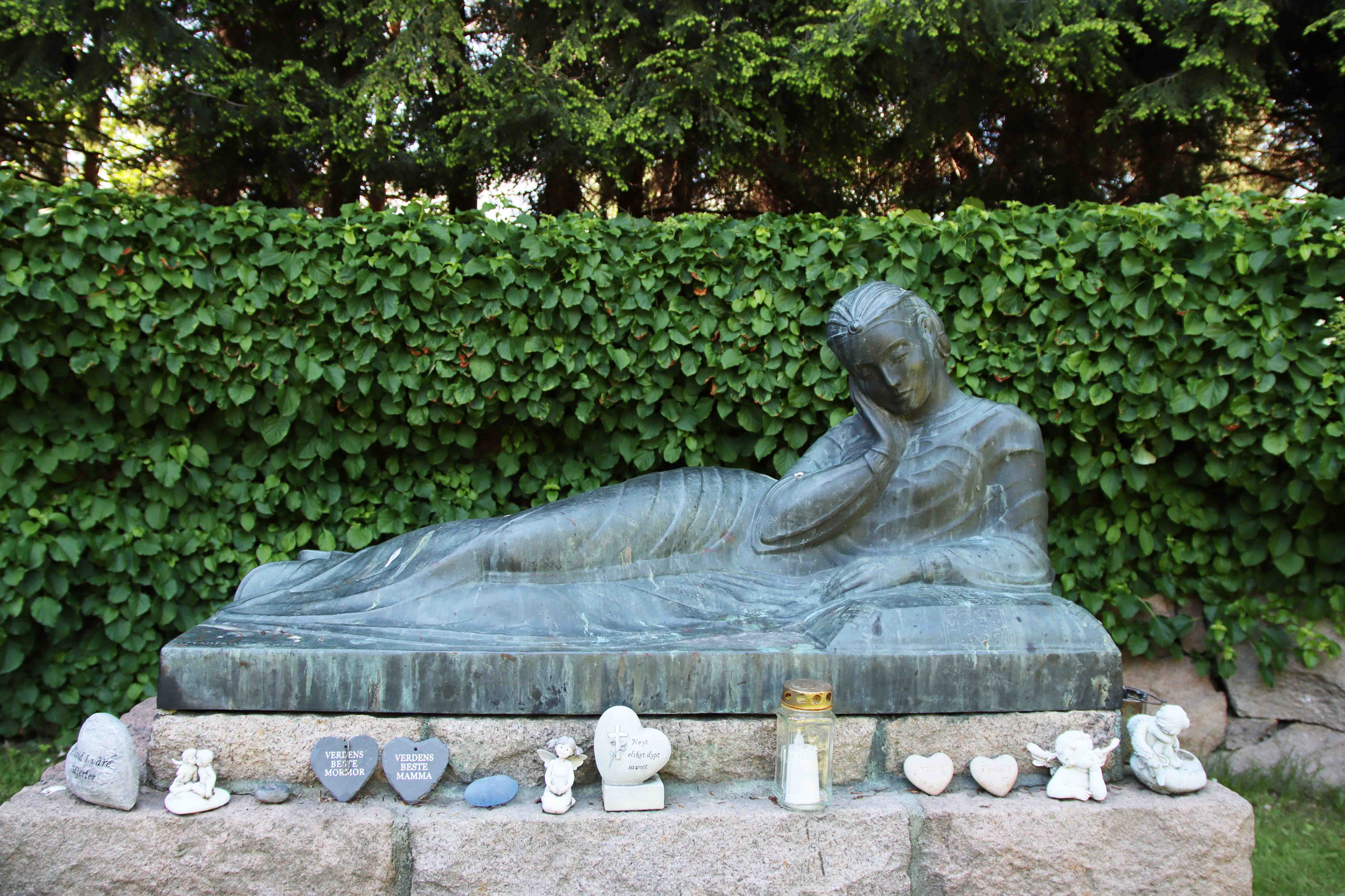 Østre Aker kirkegård med minnelunden (de anonymes gravsted) med «Hvilende kvinne» av Maria Vigeland. Foto: Sylvi Baardseth Panjwani