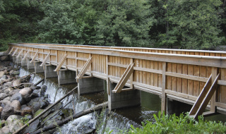 Etter Oset slusebru gjør elva en sving og renner ned mot Grønvold. Der danner elva en grunn dam som heter Grønvolddammen. Dette er et populært badested. Grønvold bru nedenfor selve badedammen er en smal og lang gangbru av tre på støpte pillarer. På begge sider av brua er det rekkverk av tre. Foto: Kjell Erik Sterten