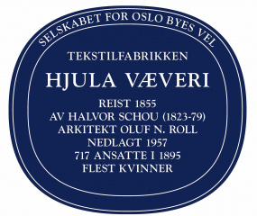 Hjula Væveri blått skilt satt opp av Selskabet for Oslo Byes Vel
