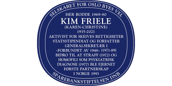 12. Haakon Tveters vei 12 er markert med et blått skilt fra Selskabet for Oslo Byes Vel hvor Kim Friele bodde fra 1969- 1980.