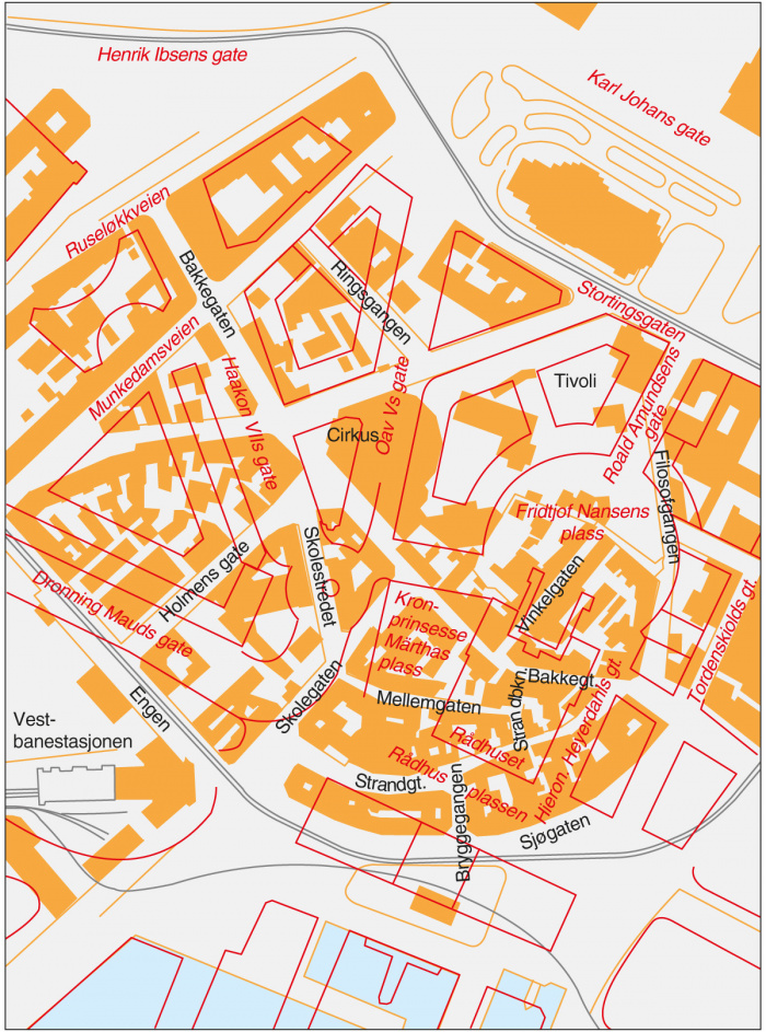 Kartskisse som viser den gamle bebyggelsen i Pipervika sammenholdt med dagens gatenett. Tidligere navn står med svart, nåværende med rødt. - Kart Ove Olsen, Bokproduksjon SA / Oslo Byleksikon