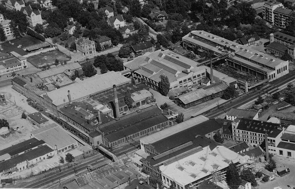 Industriområdet til Thunes mekaniske Verksted A/S. (Flyfoto) 1950. Foto: Widerøes Flyveselskap / Helge Skappel / Oslo byarkiv