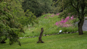 Down in The Mountain Garden we find the ‘Oslo ridge’, where we show both ordinary and rare species growing on the islands and around the inner Oslo Fjord. We visualize the special geology from the cambrosilurian period that contributes to a unique plant life. The limestone is from the area of the former airport at Fornebu. We also have a protective bed for highly threatened Norwegian species, both for living protection and seeds protected in our national seed bank. Several nature types in Norway are now threatened, and there is a ‘red list’ for them, in addition to the list of single species.